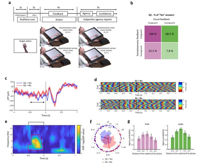 在这项实验中,研究人员分析了一位长期使用脑机接口的截瘫患者的数据。参与者通过BMI系统执行了四种手部动作(如张合拳头、屈伸拇指),随后被要求判断“是否是自己产生了该动作”。关键在于:实验故意操纵了视觉与身体的反馈信息。例如,当参与者试图张开手时,系统有时却显示为“手在合拢”——这种“错乱反馈”让大脑的感觉系统处于矛盾状态(图2a)。研究者随后发现,在这种感官冲突的情境中,决定参与者是否产生“我控制了”的判断的,不是反馈本身,而是动作发生前500到50毫秒内,M1区域的低频α波相位(图2e)。