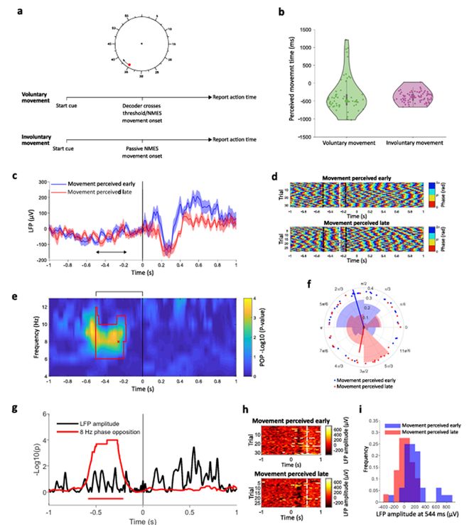 而令人惊讶的是,那些感知为“更早发生”的动作,其背后的大脑节律相位,再次集中在8Hz附近的低α波段,时间上也仍旧提前于动作发生(图3e)。更进一步的分析表明,这些相位信息远比LFP振幅等传统指标更敏感地预测主控感(图3g vs 3i)。这意味着,我们对动作时间的感知,甚至主控感的产生,可能都根植于一个非常具体的神经时钟信号。