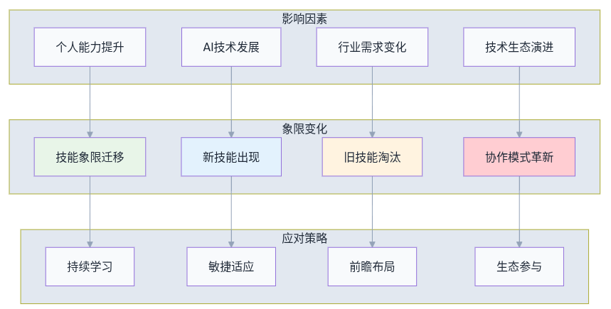重要洞察:AI时代四象限生存法则的四个象限,并不是一成不变的静态分类,而是随着个人能力提升和AI能力发展不断变化的动态系统。这种动态性是AI时代最重要的特征之一。