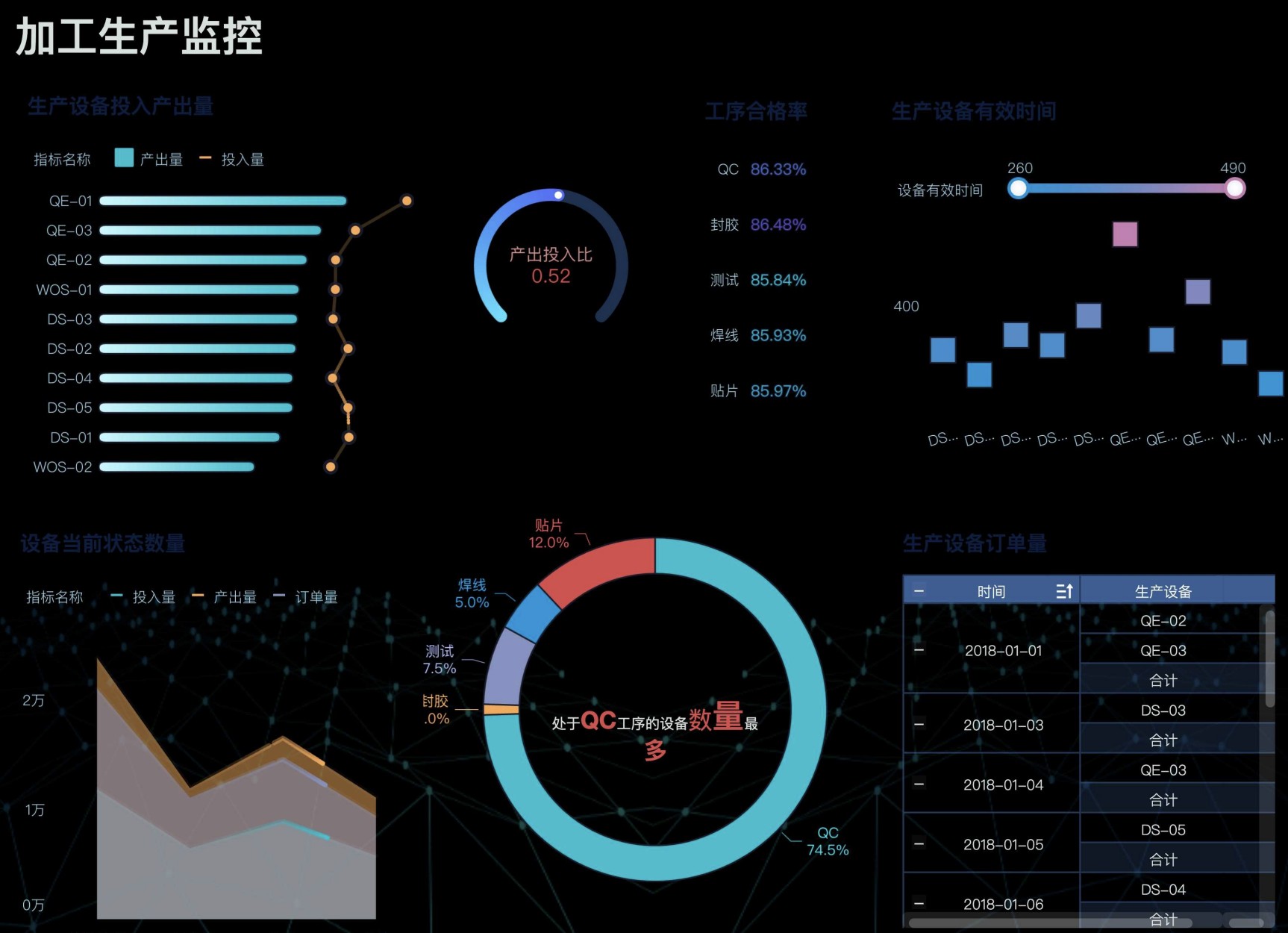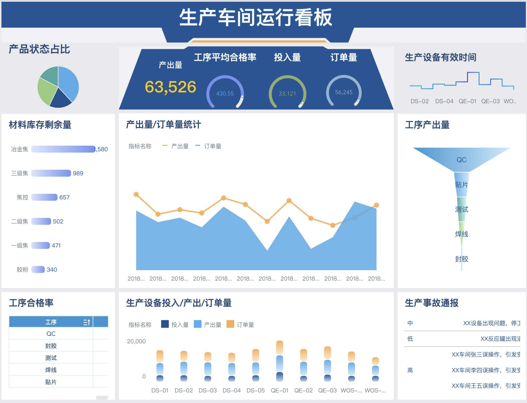通过实时监控生产车间各项数据,了解车间生产的订单完成进度、产品产出结构、工序质量概况及生产异常情况,作为生产调度和成本核算的基础数据,一眼就能看明白。