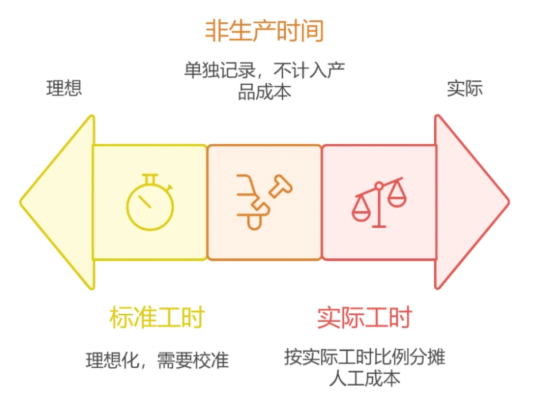 某条生产线上午换模具花了1小时,这1小时的人工成本就不能摊到当天生产的产品上,不然产品成本就虚高了。