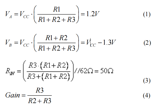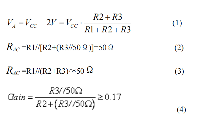 解得 R1=374Ω,R2=249Ω,R3=402Ω,输入阻抗 RIN=49Ω(接近 50Ω),增益 = 0.62。