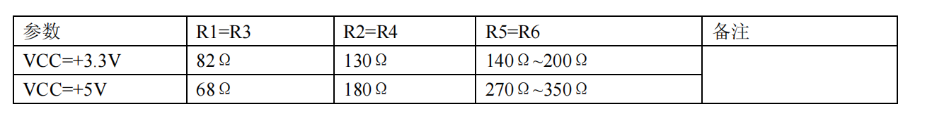 +3.3V | 2.7kΩ | 4.7kΩ | 140Ω~200Ω | 接 100Ω 电阻可降功耗 |