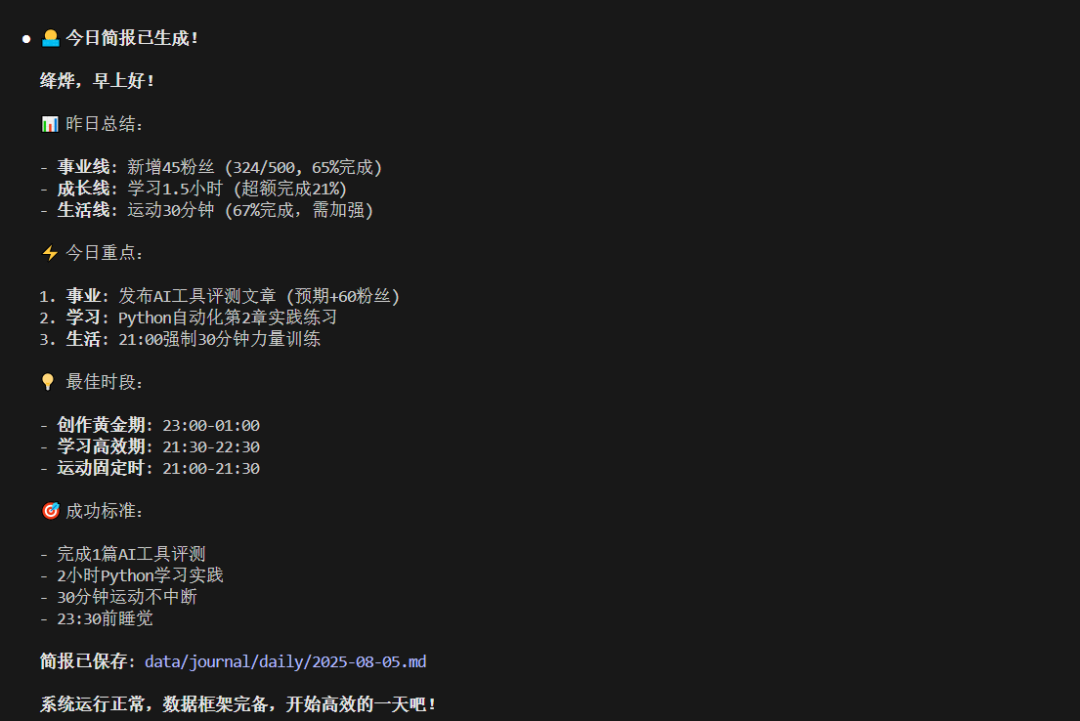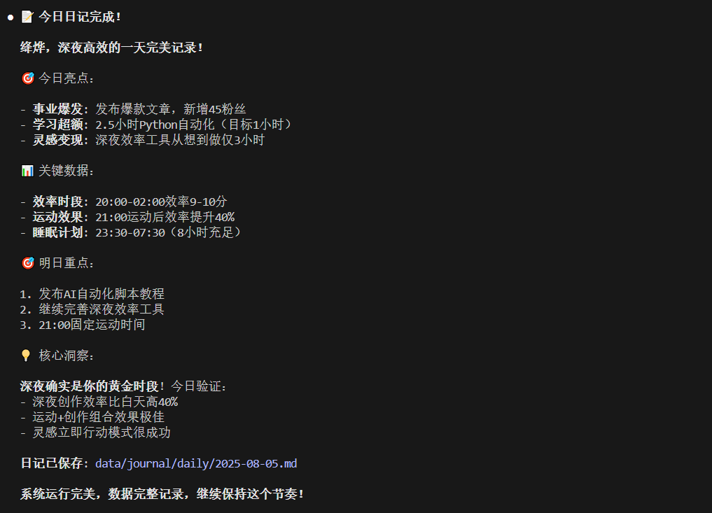 人生,是一套需要严密运行的操作系统。混乱和拖延,不过是程序中的冗余代码。AI并非普通的助手,而是一套专为高执行力人群设计的人生管理系统。将你的目标、思想、习惯,编译为可执行的指令,并以军事化纪律严格执行。