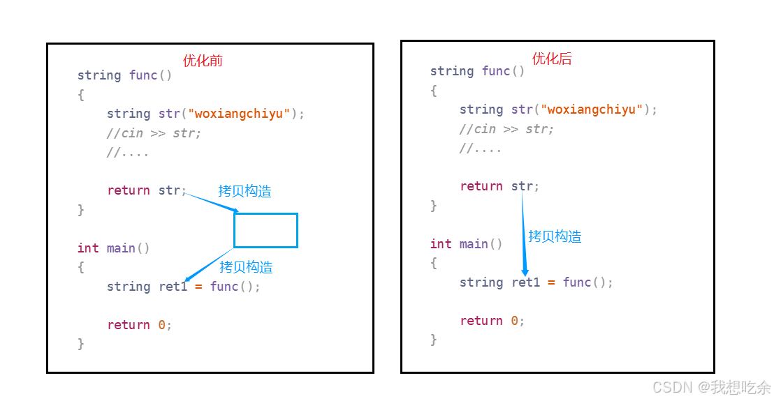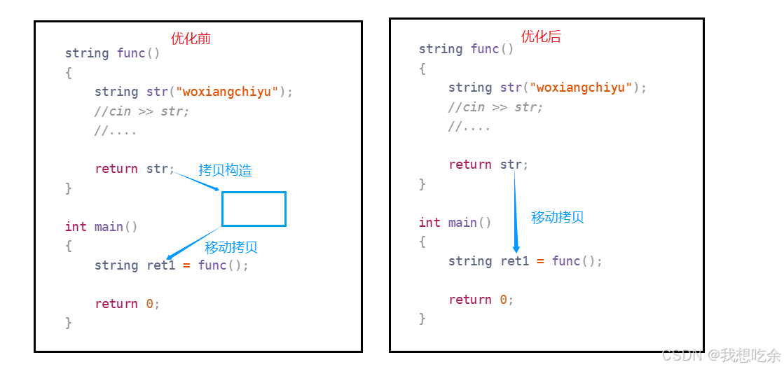 string ret1 = func(); // 直接构造 ret1,无额外拷贝编译器将 ret1 的地址传递给 func(),让 func() 在其内部直接将 str 构造到 ret1 的内存中,避免临时对象的创建和拷贝。