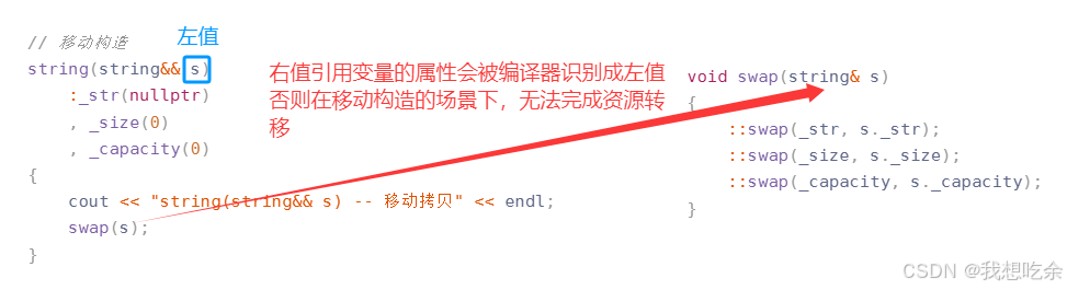 移动构造: 移动构造本质是将参数右值的资源窃取过来,占位已有,那么就不用做深拷贝了,所以它叫做移动构造,就是窃取别人的资源来构造自己,并将自己原本的无用资源再交给别人,顺便让别人再帮忙释放自己的资源。说白了,就是和目标对象进行资源交换