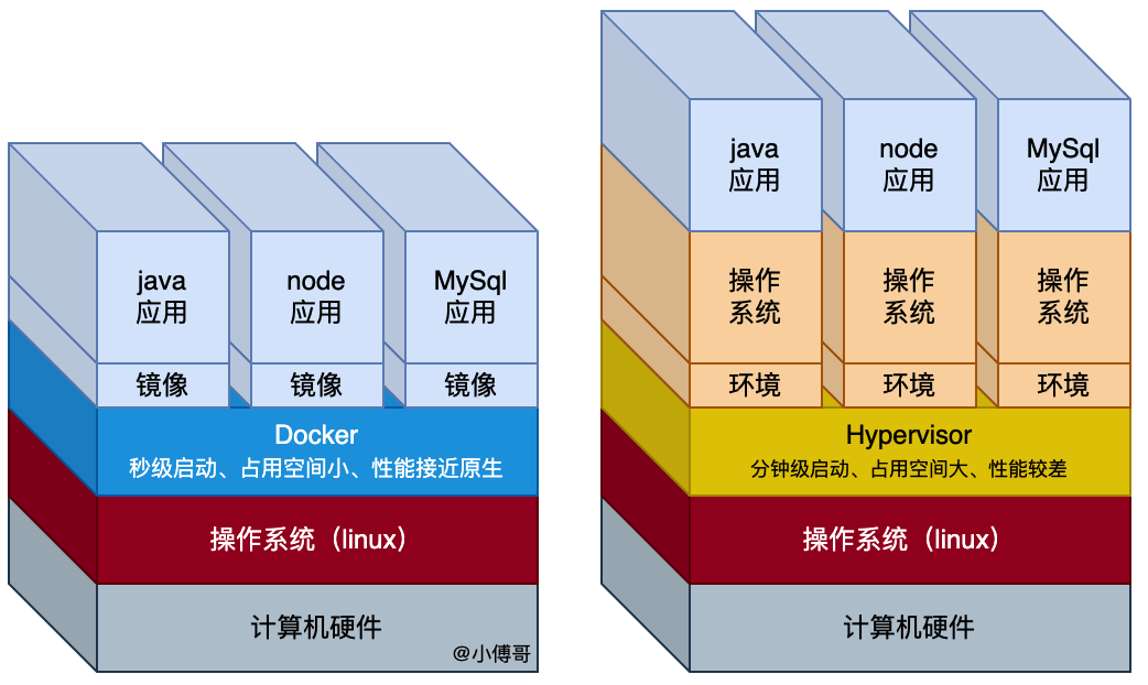 与虚拟机的安装使用相比,Docker 会把应用所需的依赖、函数库、甚至其他的软件应用可以一起打包成一个镜像,这样在应用程序运行时,就可以直接调用本地函数库,然后和 Linux 内核进行通信。有了这样的设计,你也就不需要关心每一个应用所需的环境都是啥了,也不用为每一个应用安装各类环境到 Linux 或者虚拟机了。也就做到了跨系统的运行。这有点类似于 Java 的 JVM 虚拟机。