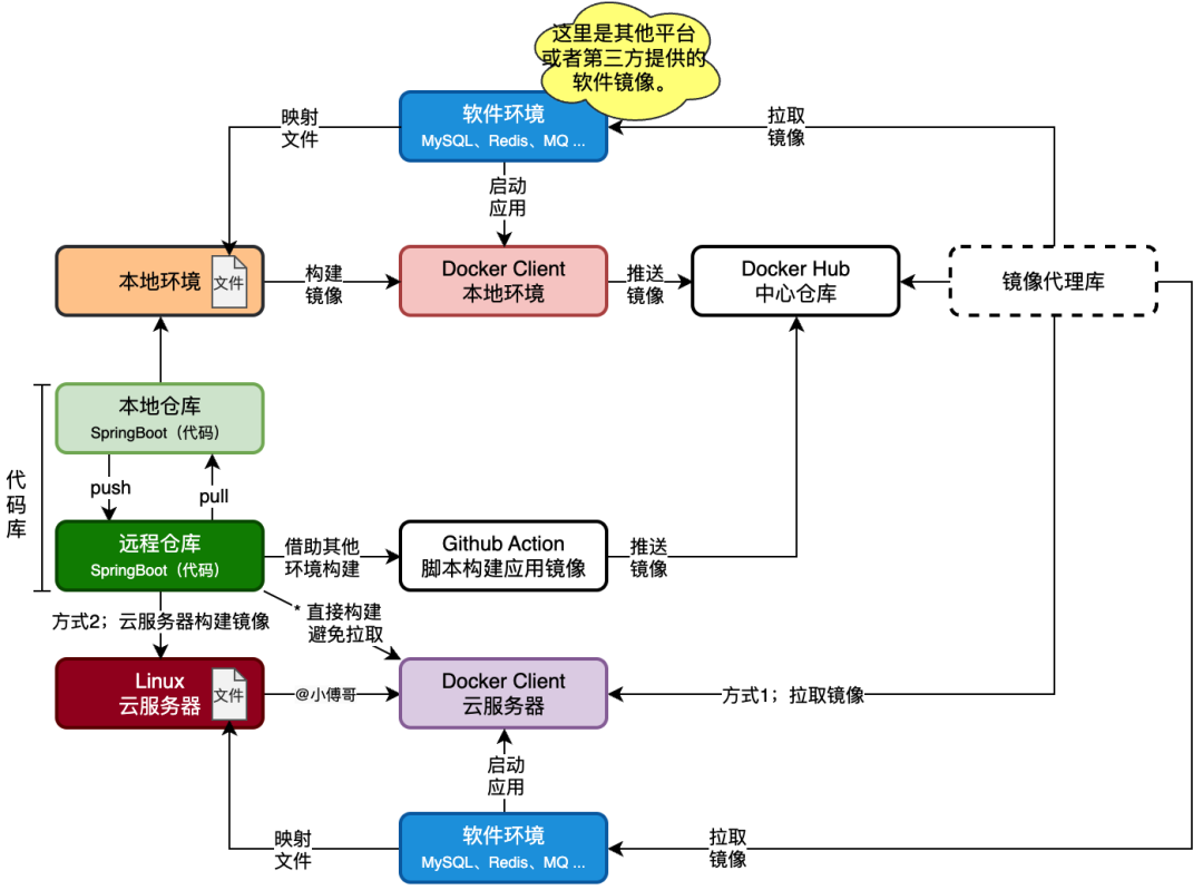 如图,这是一整套的,本地拉取镜像、部署环境、开发代码、发布镜像,再到云服务器拉取镜像、部署项目和环境的过程。在这个过程中,我们也可以借助于如 Github Action 完成镜像的构建和发布,还可以在云服务器上直接构建镜像,减少了拉取拉取的过程。