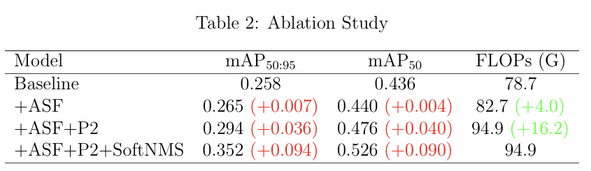 尽管取得显著改进,我们的工作仍存在局限。首先,ASF机制和P2检测层虽提升了小目标检测精度,但增加了模型计算复杂度,可能影响实时性能,尤其在计算资源受限的场景下。因此,未来工作可聚焦通过轻量化设计优化模型计算效率,确保实时应用中的性能。