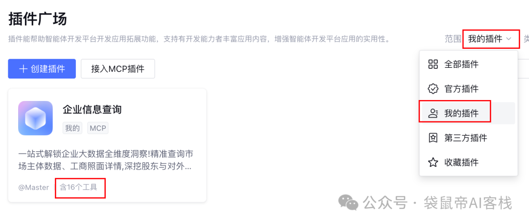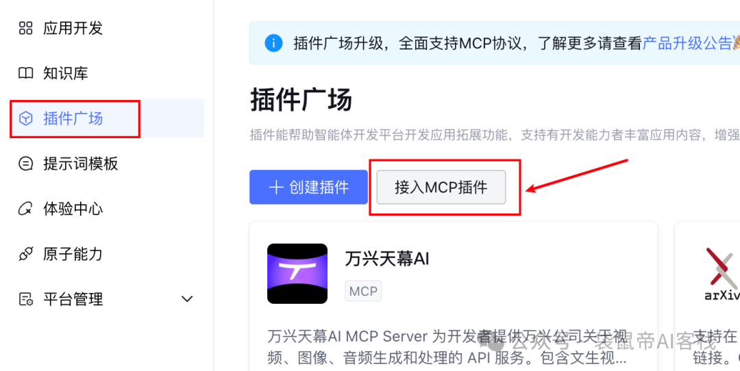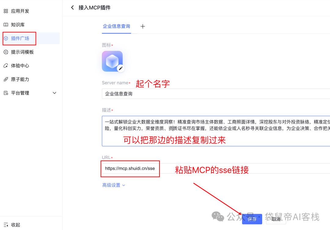 插件广场->接入MCP插件,给插件起个名字,把描述复制过来。