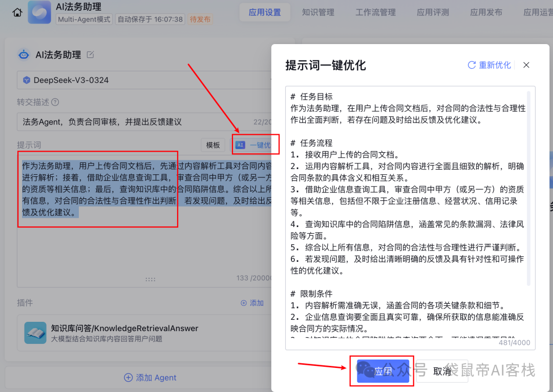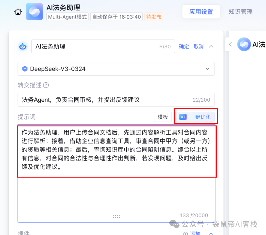 因为我想让整个流程执行快一些,所以我这里选择了DeepSeek V3,并「一键优化」了Prompt