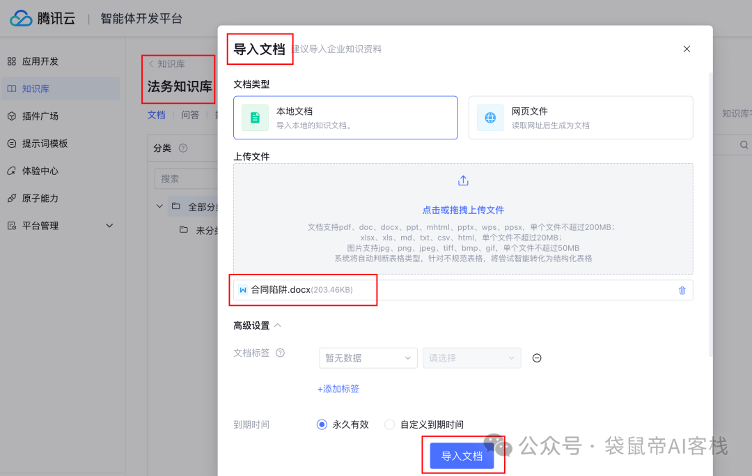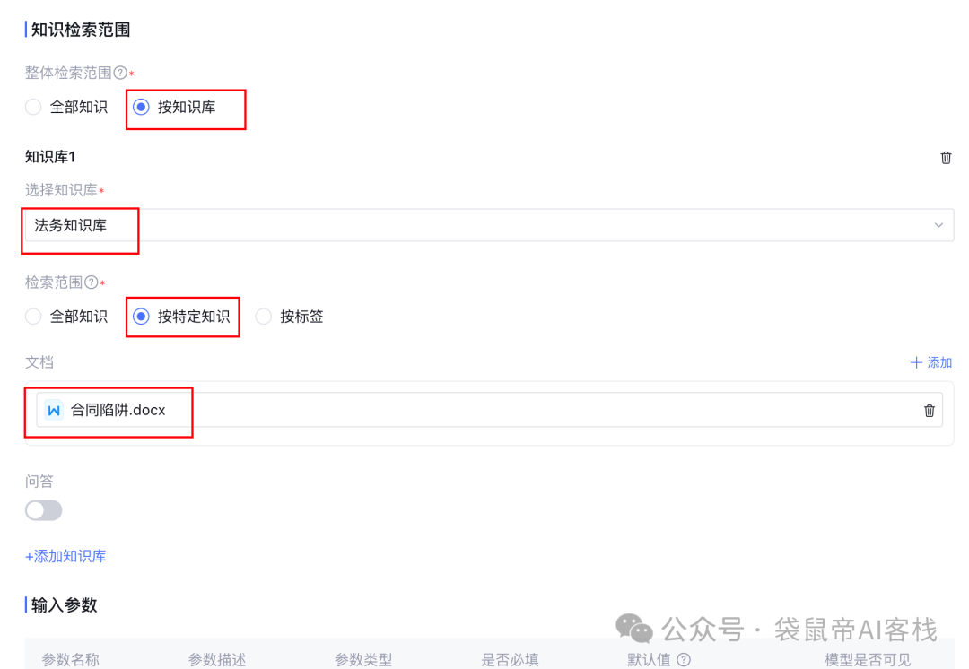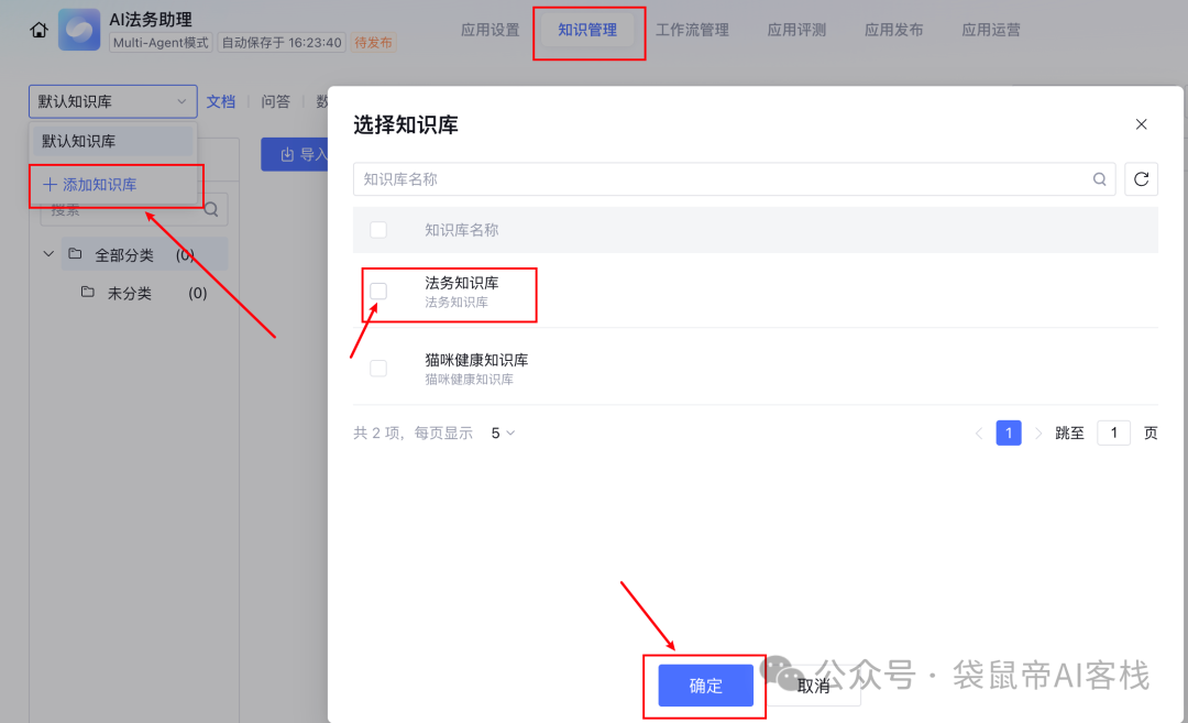 最后才发现原来是下图这样(要在智能体的「知识管理」里面先关联刚刚创建的法务知识库)