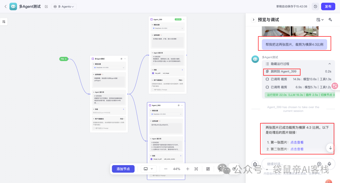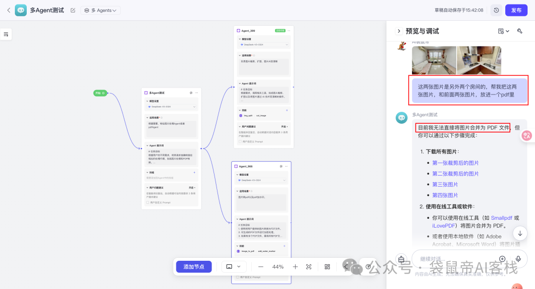 我还是测试了一下(搭建了一个同样的多Agent),第一个问题测试效果,如下图右边(让裁剪一下图片)