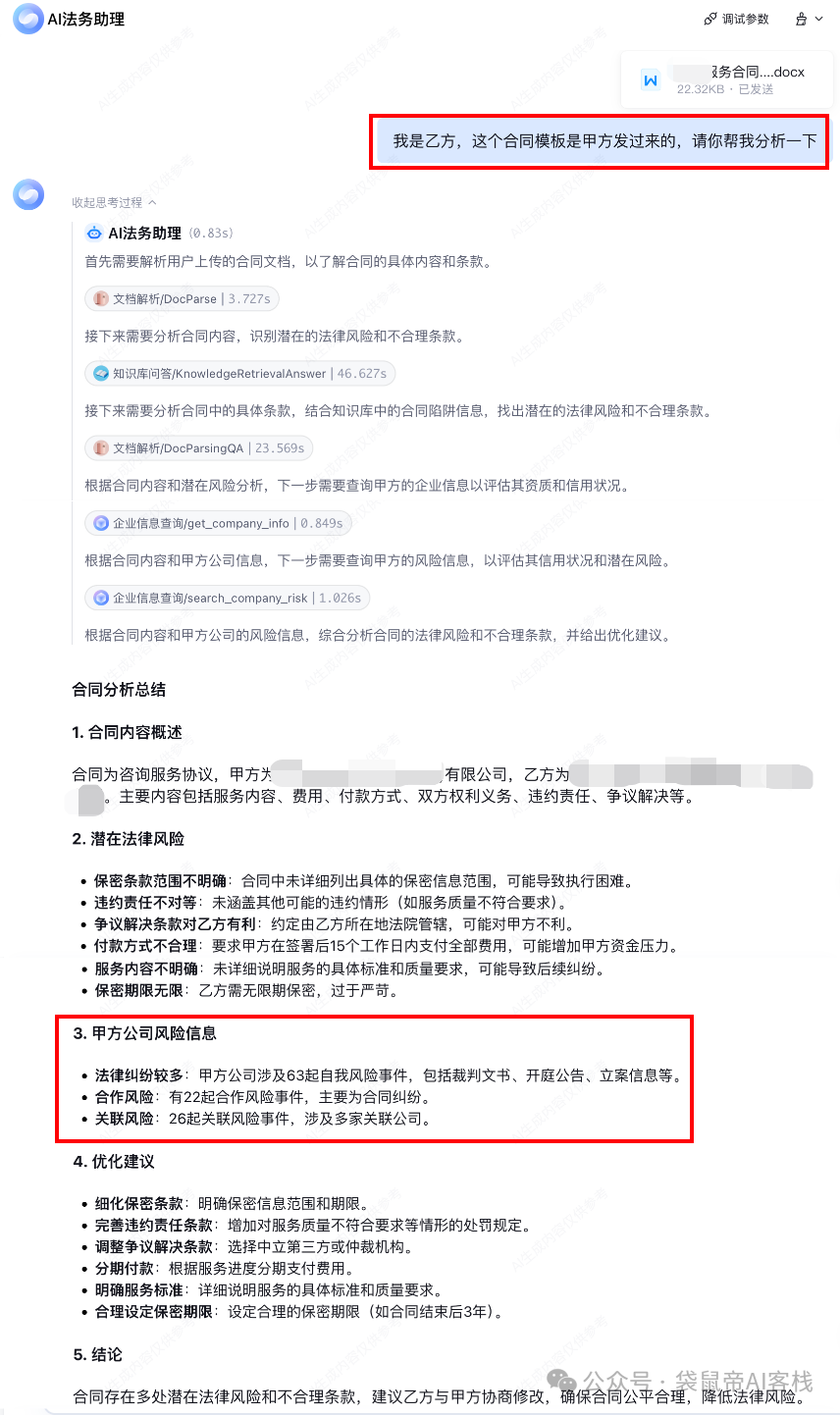 执行过程大致是这样的:虽然咱们用的是DeepSeek V3,但是智能体也会思考,边思考边执行,它确实按照我预想的那样,先调用文档解析工具,解析合同内容。