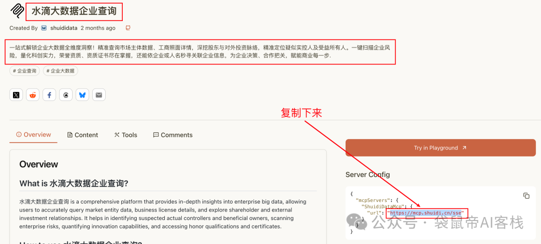 于是我打开了mcp.so,搜索企业这个关键词,找到一个叫「水滴大数据企业查询」的MCP-Server