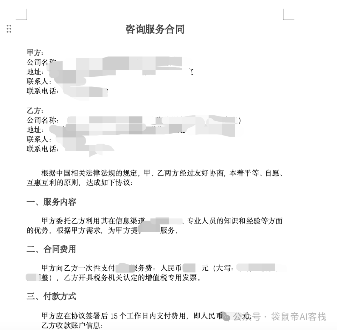 所以,为了后续不用费力去加马赛克,我把原版合同文件的重要信息改了一下,用来继续测试。