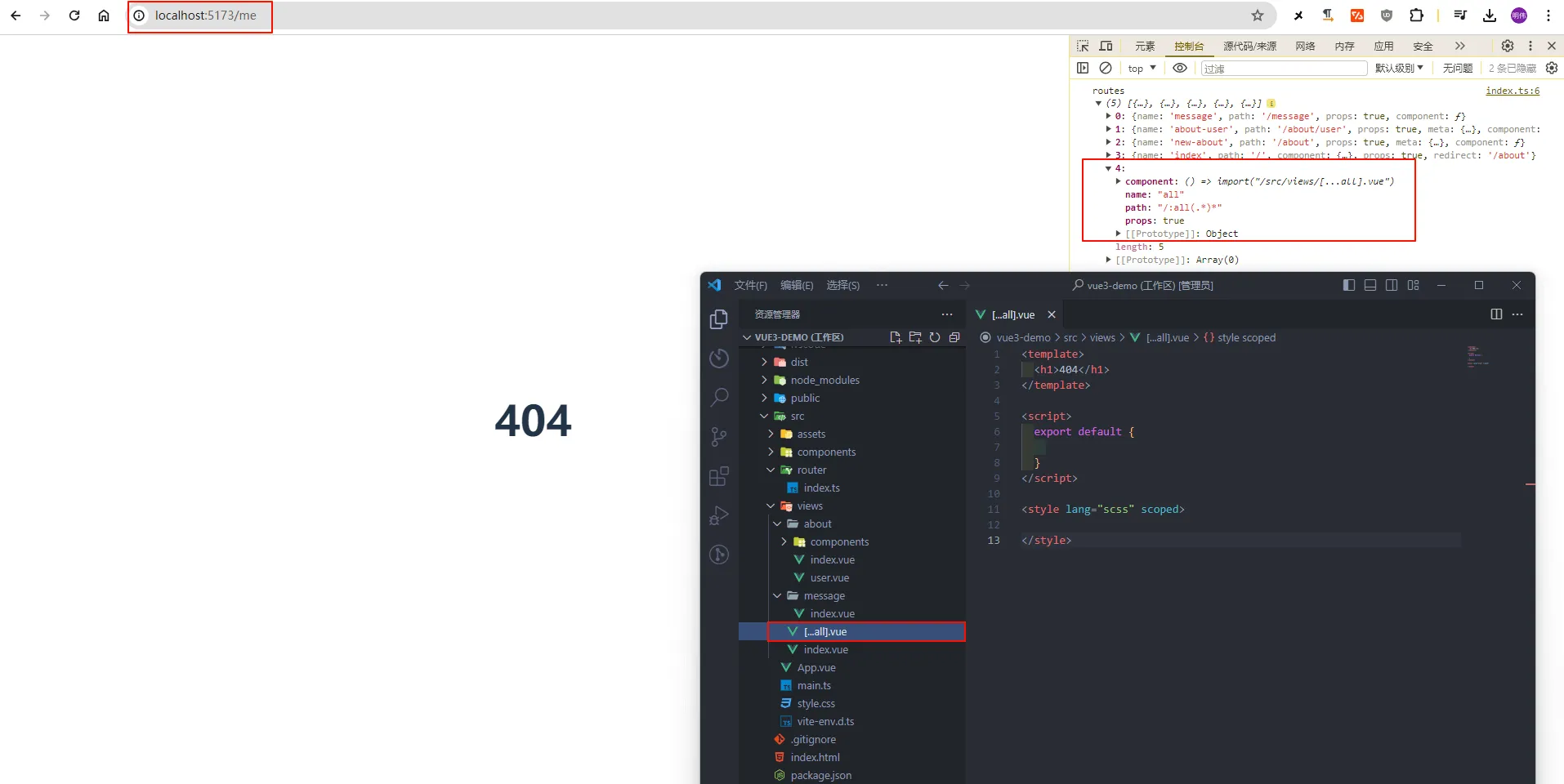 src/pages/[user]/settings.vue -> /:user/settings (/one/settings)5、 配置 404 拦截页面,在 src/views 目录下添加 ...all.vue:
