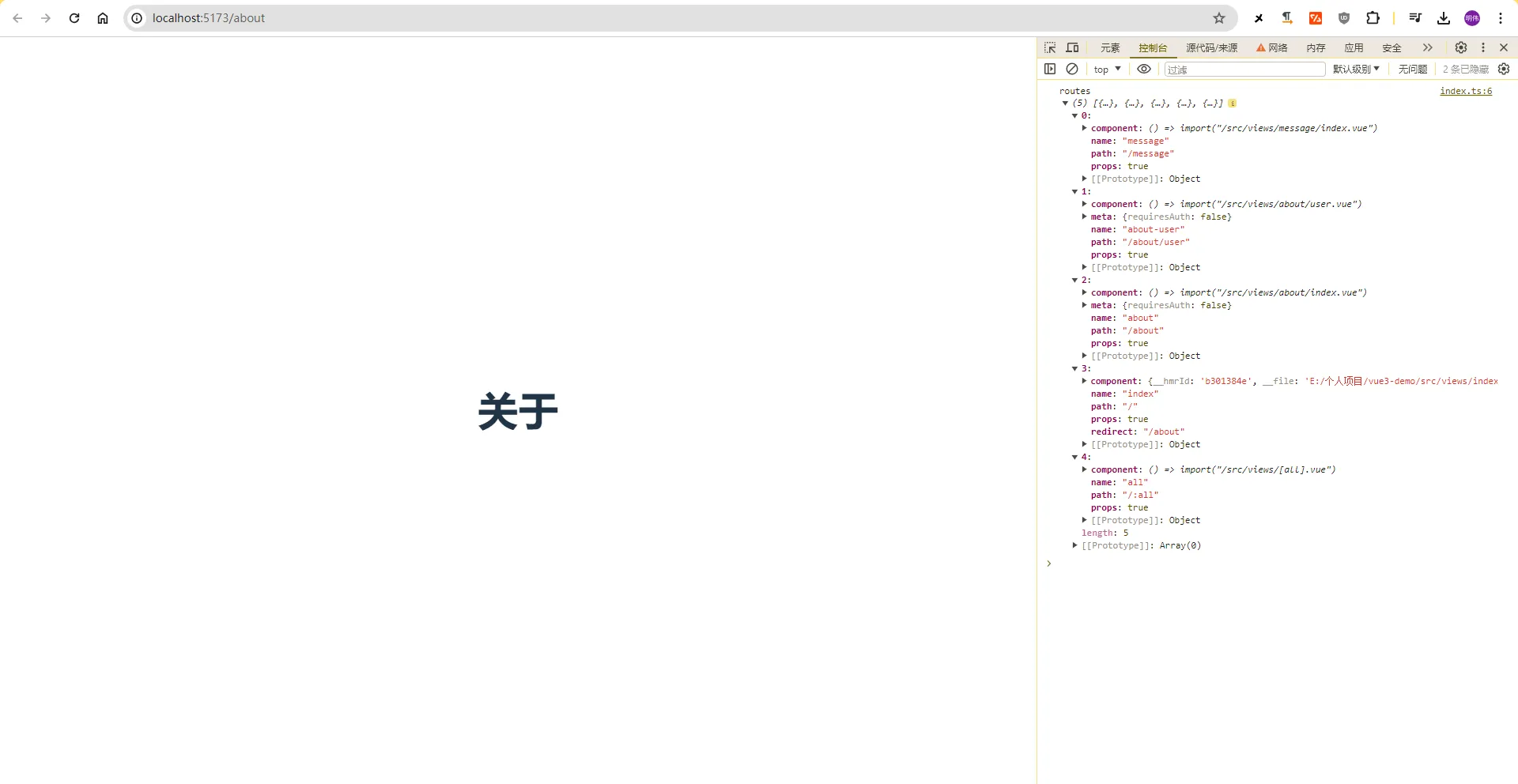 2、 我们在 router/index.ts 打印一下 routes ,会得到默认的路由配置,这时候我们就可以访问路由了: