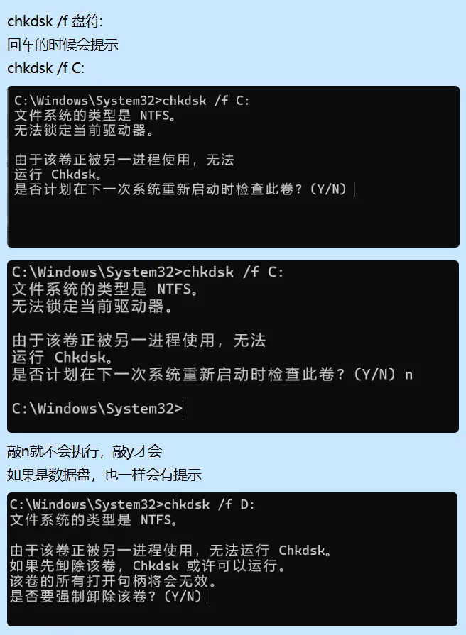 winpe下是纯离线校验,不会有y/n的交互,直接就开始校验了,比下次开机时那种校验安全可靠一些,校验并不能保证损坏得很严重的文件系统在校验后100%没问题,别把希望都压在chkdsk,有条件的话最好能配置定期快照策略,有文件系统异常之前最就近的正常的文件系统的快照)