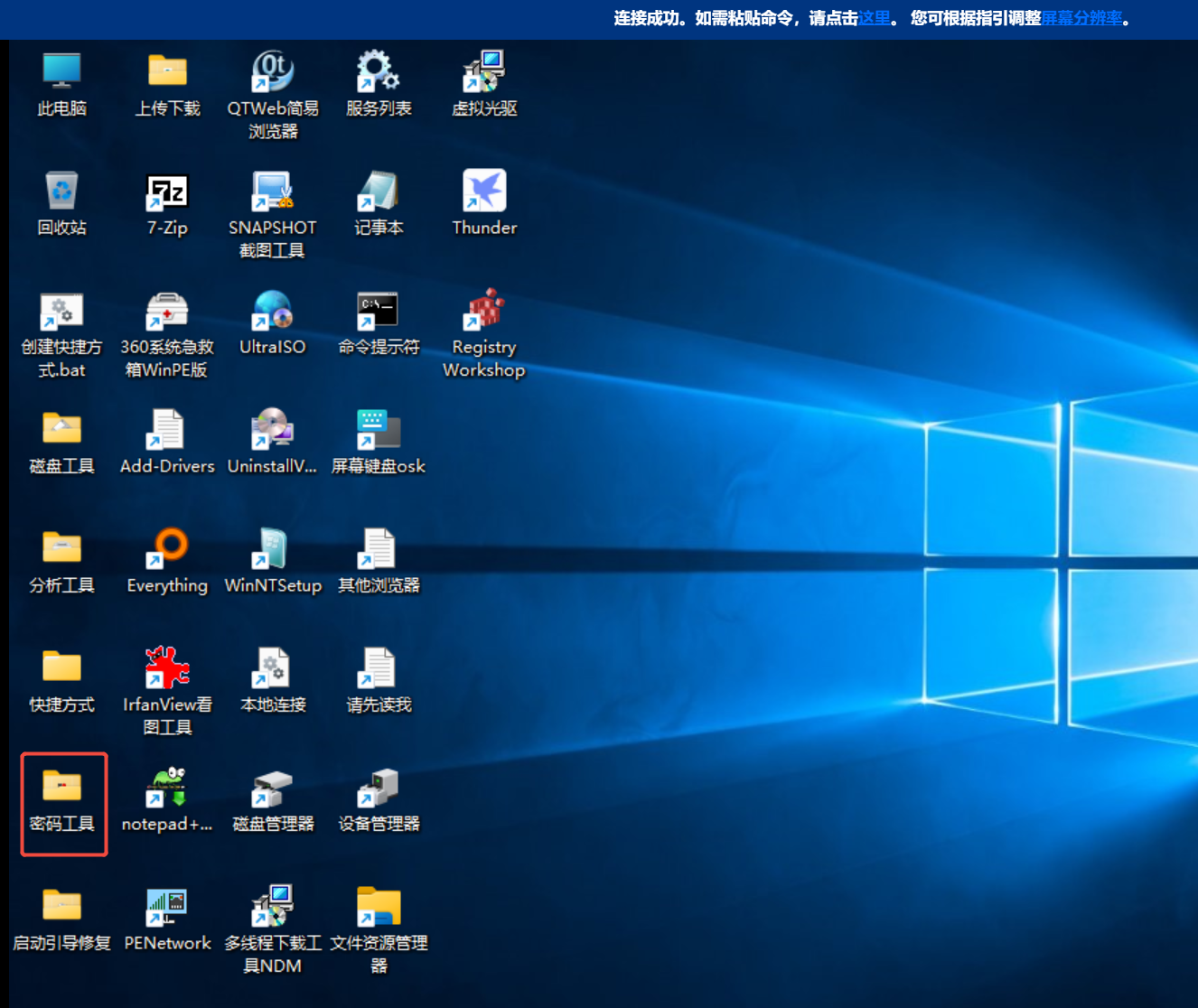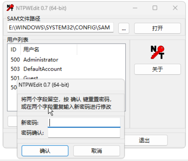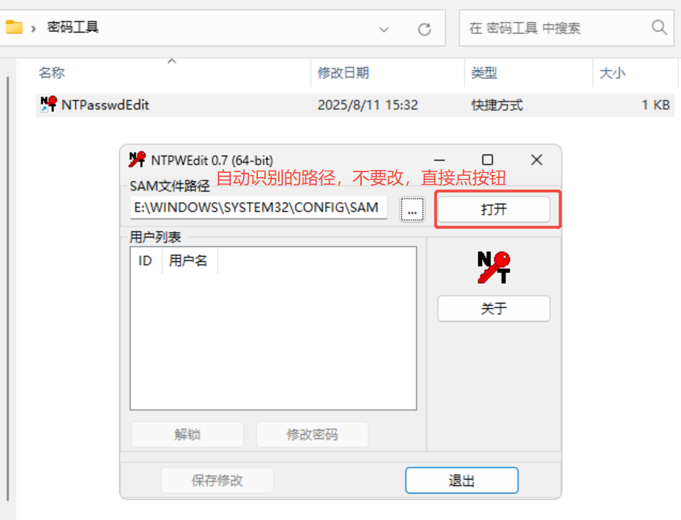 2、双击创建快捷方式.bat,等待cmd窗口自动消失后找到"密码工具"--NTPWEdit重置密码