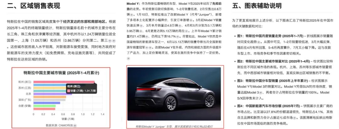 报告中包含丰富的图表展示,比如特斯拉中国月度销量趋势折线图、主要城市销量柱状图、中国新能源汽车市场份额饼图等。更重要的是,它把图片中表达的信息融入到报告文字当中,提供更全面的文字解读。