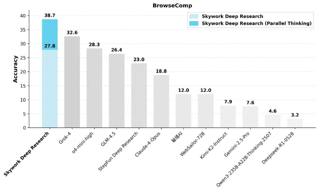 性能究竟有多强,先上跑分成绩。首先在权威搜索评测榜单 BrowseComp 中,Skywork Deep Research 在常规推理模式下正确率已达到 27.8%,超越了 GLM-4.5、StepFun Deep Research、Claude-4-Opus 等国内外大多数主流同类产品;而在启用自主研发的「并行思考」模式后,准确率更是跃升至 38.7%,一举刷新行业 SOTA 记录,将 Grok-4 在内所有竞品甩在身后。