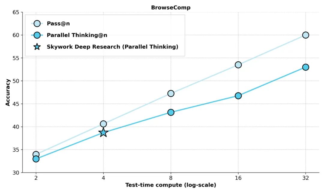 并行思考模式下,Skywork Deep Research 的正确率随思考时间延长持续攀升,验证了其自研系统架构在推理深度与扩展性上的巨大潜力。
