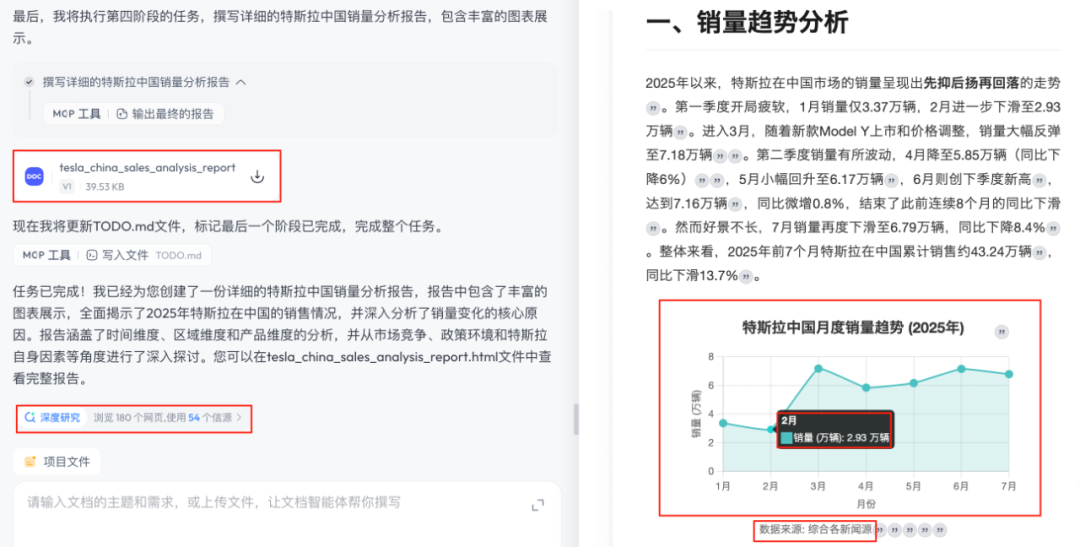 在浏览了 180 个网页、使用 54 个信源后,最终输出一份详细的特斯拉中国销量分析报告。