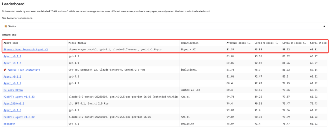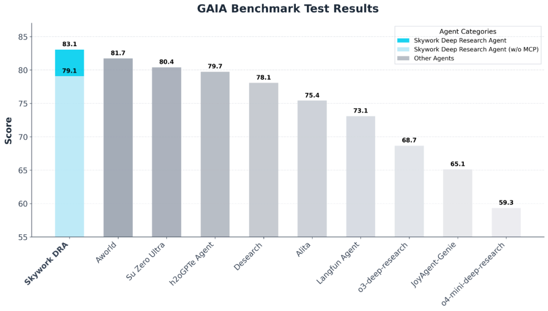 此外,在全球最具挑战性、覆盖最广的智能体基准测试集 GAIA 中,Skywork Deep Research Agent 同样刷新 SOTA 成绩,超越所有竞品,复杂任务中的硬核表现不言而喻,也为其技术含金量做出有力背书。