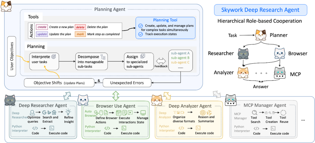 在这一 MCP Manager Agent 的基础上,一个将模型能力与工具能力结合起来的协同多智能体框架形成,不仅能高效组织多个 Agent 协作,还通过动态创建 MCP 工具来强化任务应对能力和环境适应能力。下图整体架构中一一显示出 了规划 Agent、深度调研 Agent、浏览器使用 Agent、数据分析 Agent 和 MCP Manager Agent。