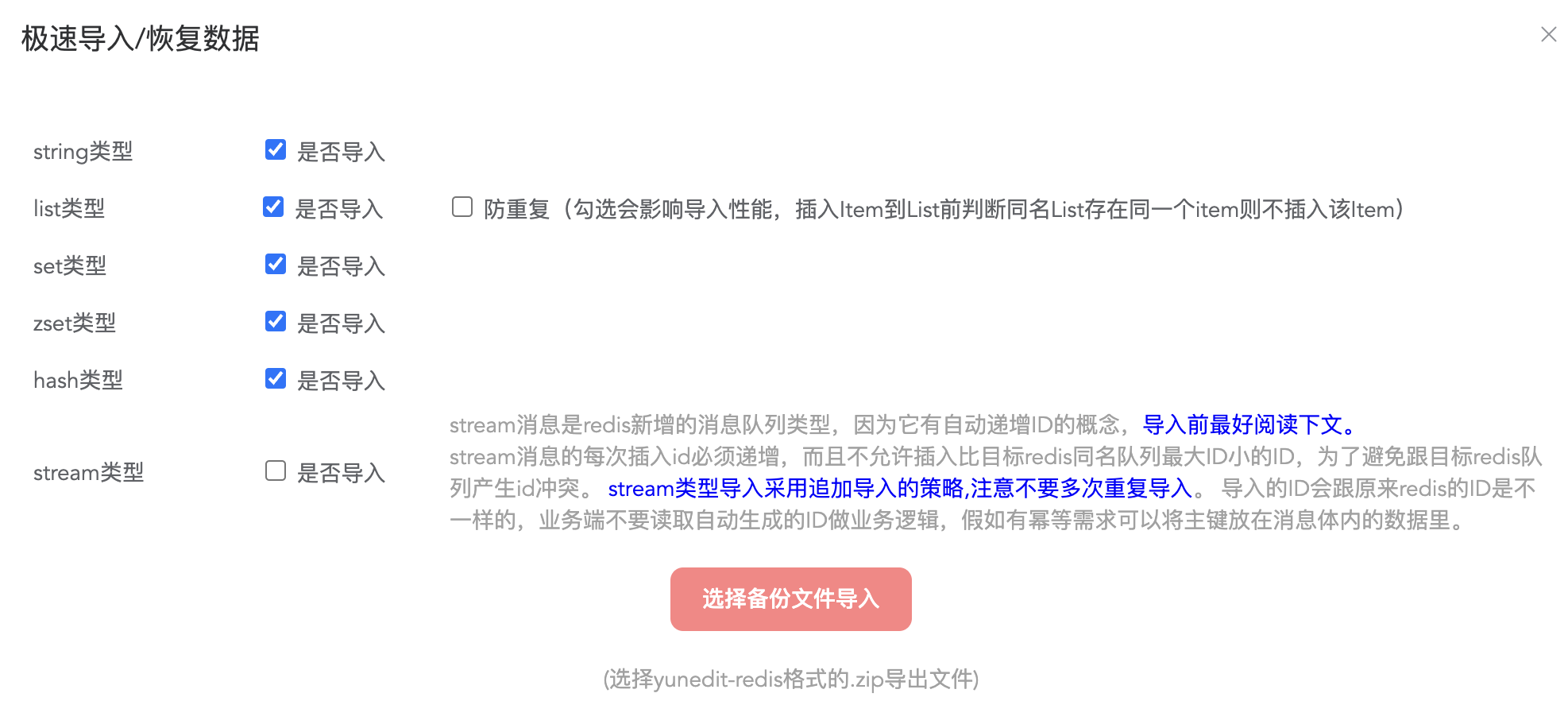 比如自定义导出,有些版本的redis是不支持stream格式的,你可以选择不导出stream类型的数据: