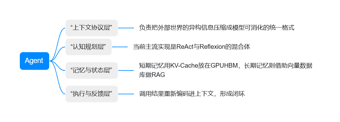 业界常把Agent拆成Planning、Memory、Tools、Action四部分,这种分类固然直观,却容易忽略系统级约束。更严谨地看,Agent运作在四个相互解耦的层级之上。