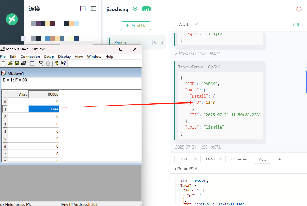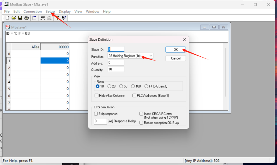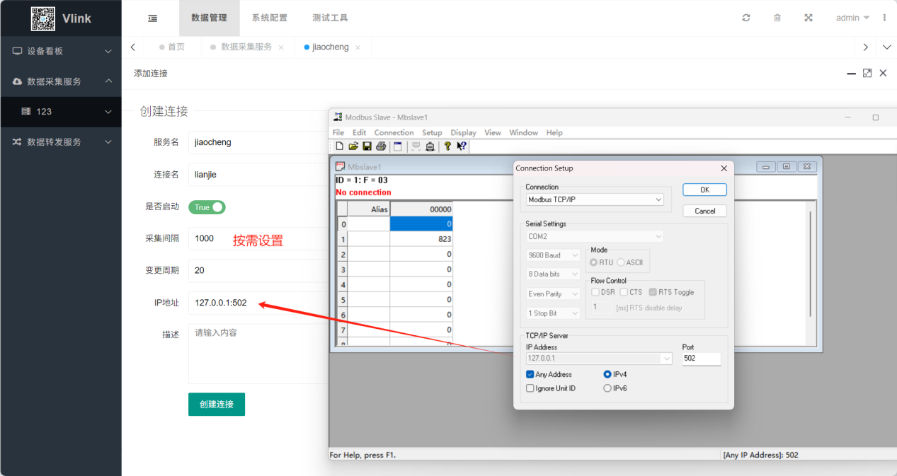 2.使用Modbus TCP协议,本地主机地址,默认端口创建连接