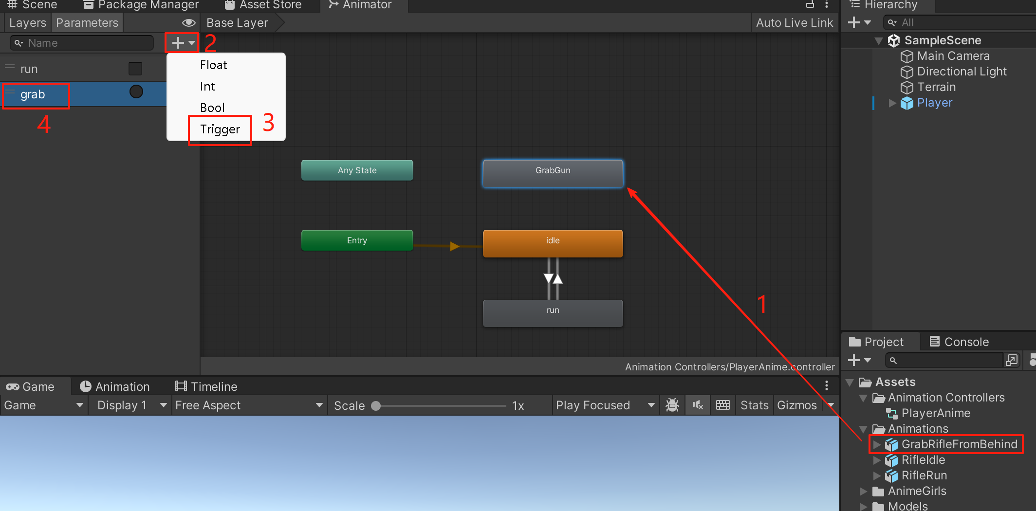 2.第二步打开角色动画器,先把“拔枪动画”拖拉到动画器上。然后点击左侧菜单的新增变量的按钮“+”号,创建一个Trigger类型的触发变量(我这里命名为“grab”)。