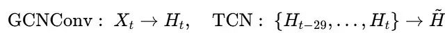 输出张量 (batch, horizon, N)时间GNN(TGNN)基于GNN的空间(图)结构建模能力,通过添加时间卷积网络(TCN)来捕获序列模式。在学习图结构A后,在每个时间步应用图卷积,然后将节点嵌入序列输入扩张1D卷积: