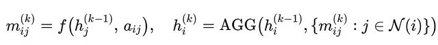 边消息计算: m_ij = f(h_i, h_j, a_ij)