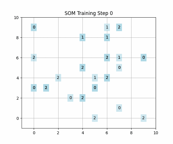 print(f"Time Step {t+1:02d} - Input: {np.round(x, 2)} - BMU: {bmu}")