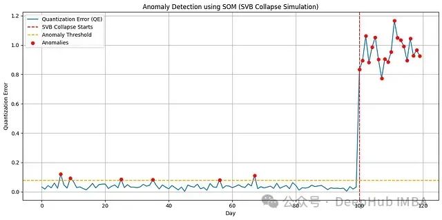从结果图中可观察到,系统不仅识别出了模拟的SVB崩溃事件(100天后的连续异常),还在正常期间发现了几个潜在的异常点,这表明SOM具备识别微小偏差的能力。