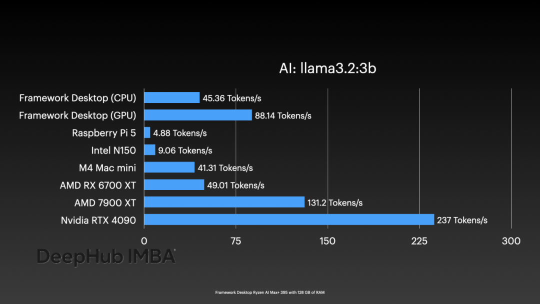需要说明的是,上述性能比较中Framework集群的0.7 t/s数据基于Llama 3.1 405B模型测试,而其他系统的数据基于DeepSeek R1 671B模型(均采用Q4量化),因此这一比较并非完全等价。