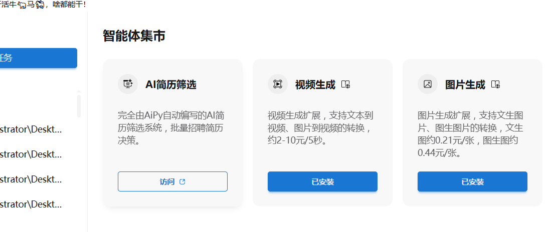 这是AiPy pro 0.8增添的最新功能,包括三款应用:图片生成、视频生成、AI简历筛选应用(使用前需先前往智能体集市安装)