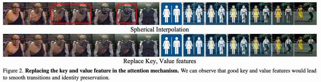 先验驱动的自注意力机制。虽然本文的特征融合技术在图像变形中显著提升了身份保持,但本文发现,在正向扩散和反向去噪阶段统一使用该方法,可能会导致图像序列变化极小,无法准确表现输入图像(见下图 6)。这一结果是预期中的,因为潜在噪声在反向去噪过程中会产生较大影响,如下图 3 所示。因此,应用本文在公式 5 中描述的特征融合方法时,会引入模糊性,因为来自输入图像的一致且强约束导致每个潜在噪声 显得相似,从而限制了过渡效果的表现力。