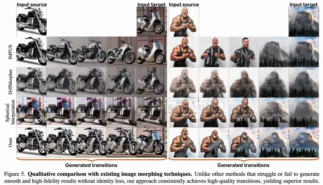 定性对比。 在下图5中提供了与现有图像变形方法的定性对比。一个有效的图像变形结果应当展现从源图像(左)到目标图像(右)的渐进过渡,同时保留原始身份。基于这一标准,可以得出以下几点观察: