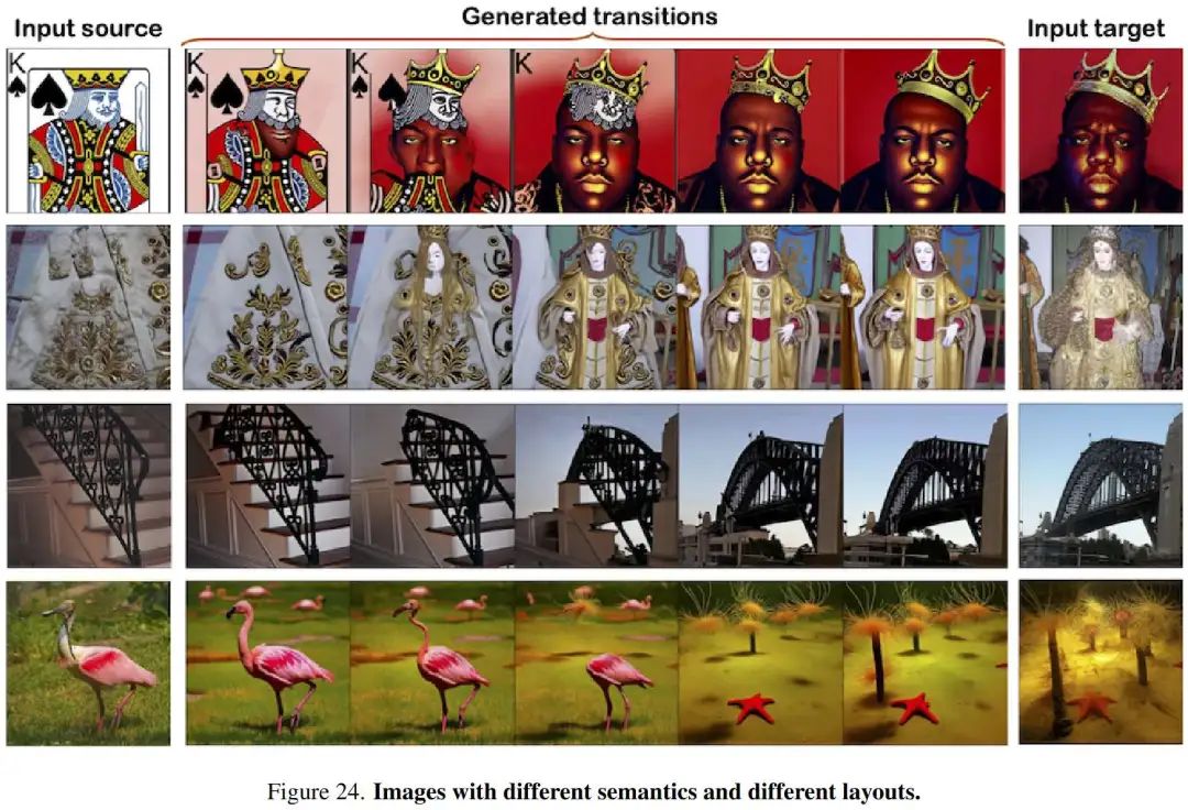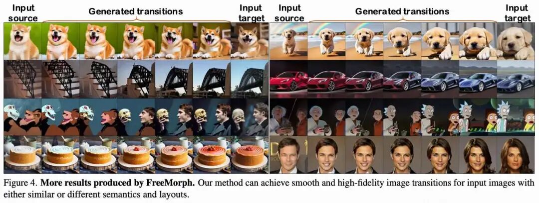 定性结果。 在上图1和上图4中,展示了由 FreeMorph 生成的广泛结果,这些结果持续展示了其生成高质量和平滑过渡的能力。FreeMorph 在多种场景中表现出色,能够处理语义和布局不同的图像,以及具有相似特征的图像。FreeMorph 还能够有效处理细微变化,例如颜色不同的蛋糕和表情不同的人物。