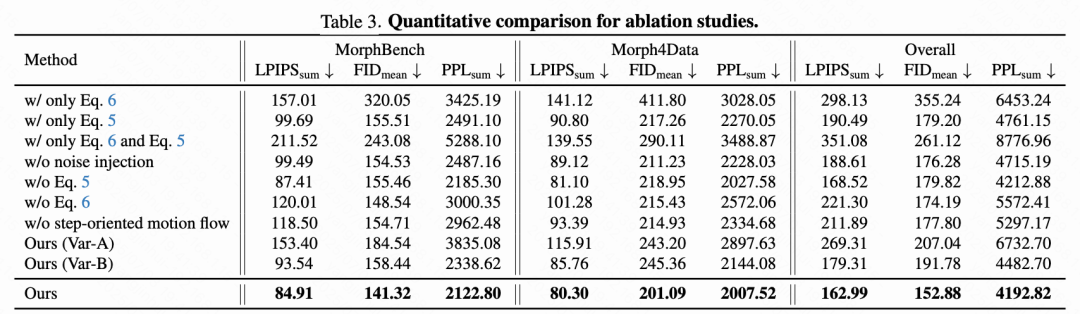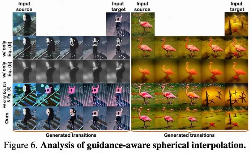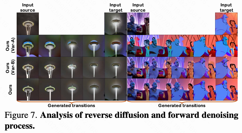 反向与正向过程分析。 在下图7中,本文将本文的方法与两个变体进行比较:(i) “Ours (Var-A)”,省略原始注意力机制,(ii) “Ours (Var-B)”,在反向与正向过程中交换引导感知球面插值与面向步骤变化趋势的应用步骤。将这些变体与本文的最终设计进行比较表明: