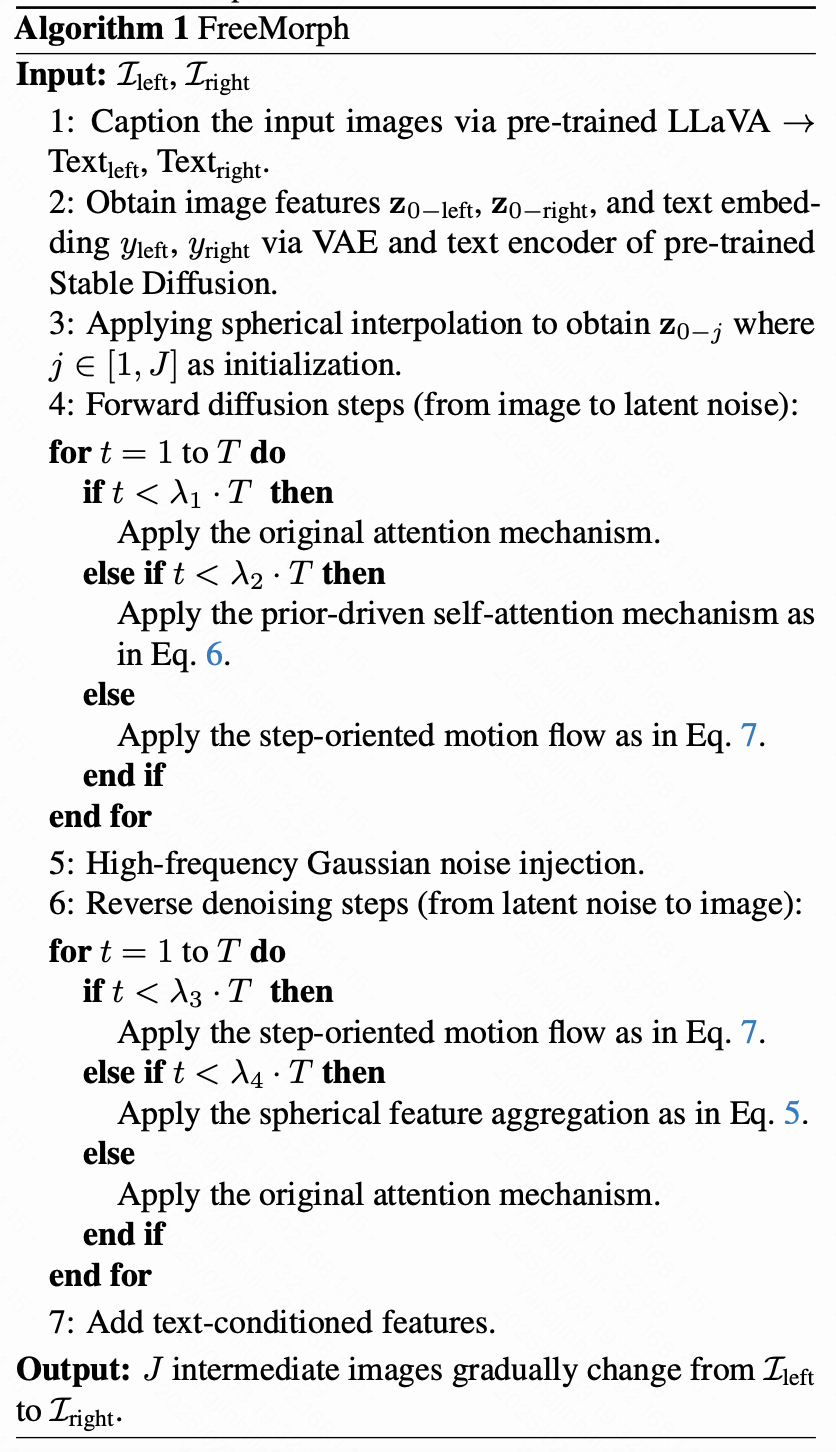 给定两张独立的输入图像 和 ,本文的目标是在无需调参的前提下,生成一系列中间图像 ,实现从一张图像平滑过渡到另一张图像的过程。本文实验中设置 。如下算法 1 所示,本文的流程以预训练的扩散模型为基础,并在多步去噪过程中引入来自输入图像的引导信息。