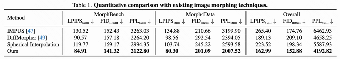 按照 IMPUS 和 DiffMorpher 的方法,本文使用以下指标进行了定量比较: