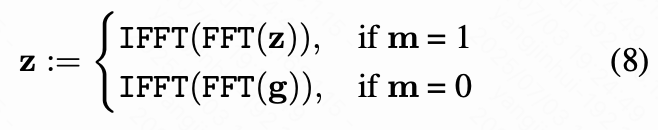 这里, 和 分别表示逆快速傅里叶变换和快速傅里叶变换。 表示一个随机采样的噪声向量, 是一个与 同尺寸的二值高通滤波器mask。