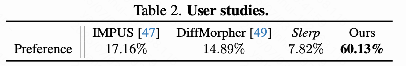 用户研究 为了通过引入人类偏好增强本文的对比分析,进行了用户研究。招募了30名志愿者,包括动画师、AI专家和年龄在20至35岁之间的游戏爱好者,来选择他们偏好的结果。每位参与者被展示了50对随机的对比结果。这些结果展示在下表2中,表明本文提出方法的主观有效性。需要注意的是,slerp 表示仅应用球面插值的方法。