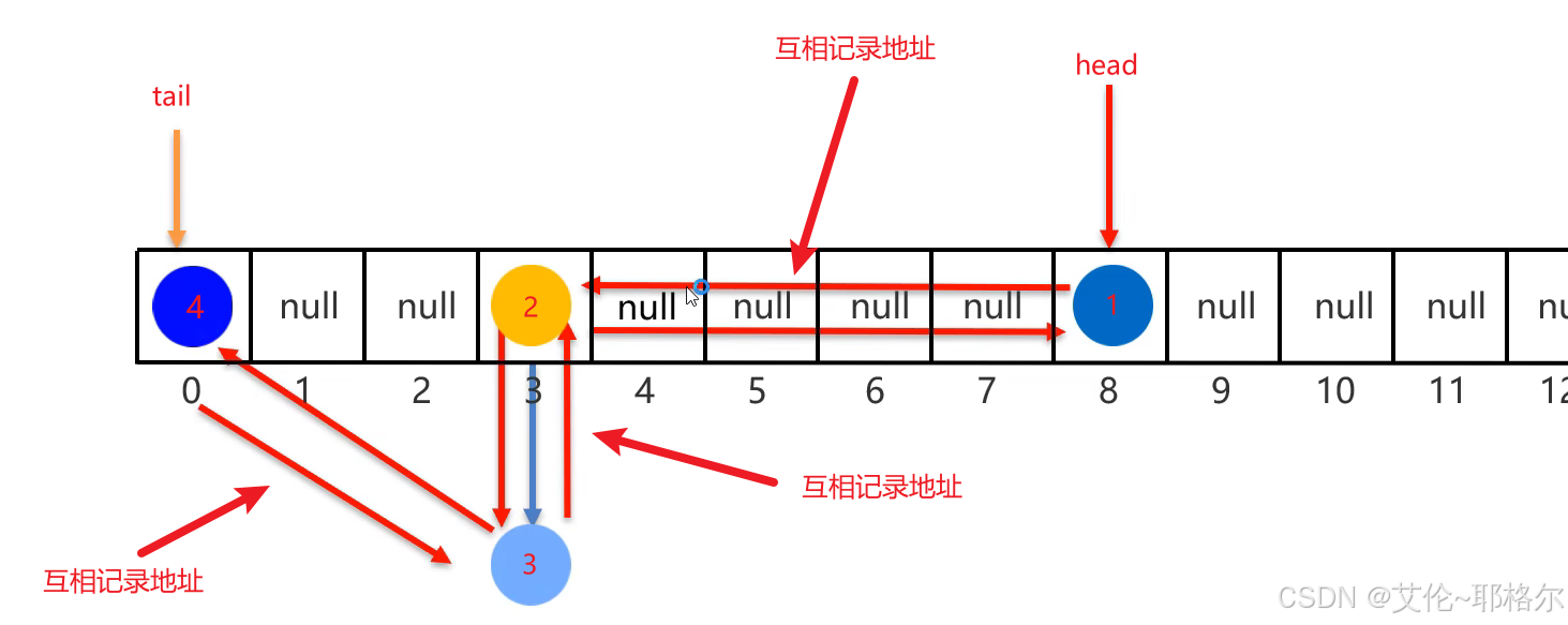 -> 接下来1号元素和2号元素会互相记录对方的地址值,从而形成了一个双链表