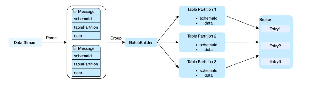 在客户端引入批消息容器(Batch Message Container),每个容器承载同一 Table Partition 的消息集合,实现分区内的高效聚合。